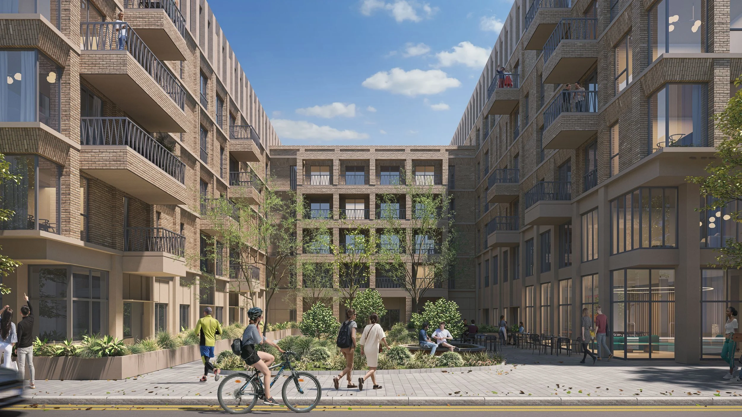 A mix of private, secluded balconies and generous shared outdoor spaces such as a rooftop terrace and landscaped gardens allow residents to enjoy both privacy and community, while taking in views of the surrounding townscape. New planting across the site is carefully designed to provide both visual interest and natural acoustic screening from neighbouring properties, enhancing the sense of tranquillity within the development.